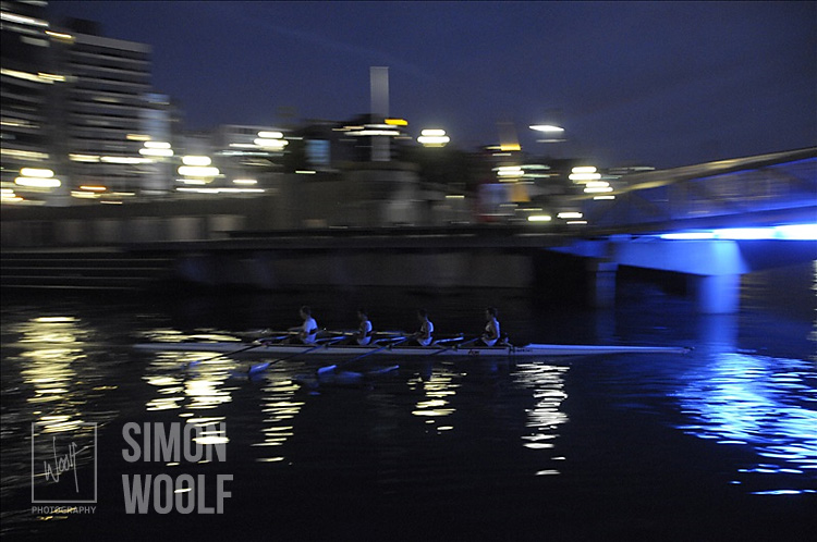 The resulting body of work, centered around an early morning training session on the harbour, literally at first light, is a series of documentary shots of oars and boats at speed ("Into the Blue I & II") and moody silhouetted figures in the creeping light of day, on flat water.